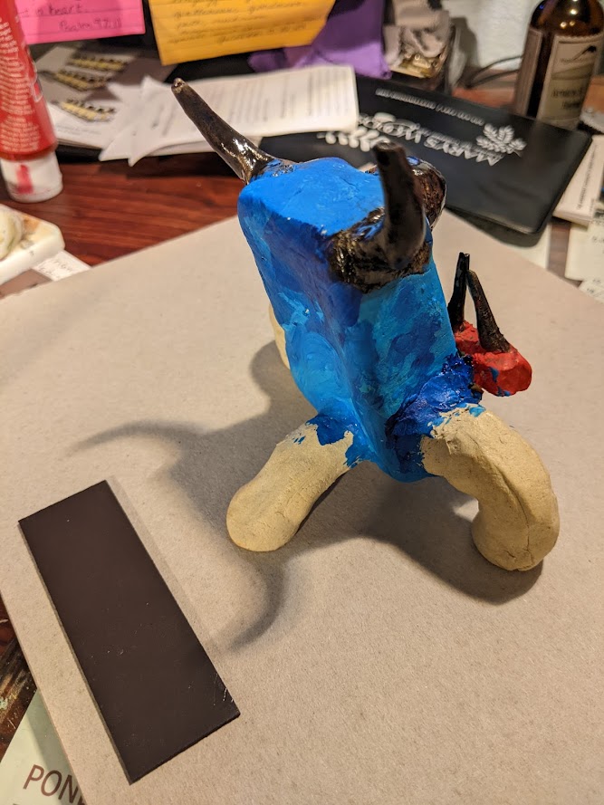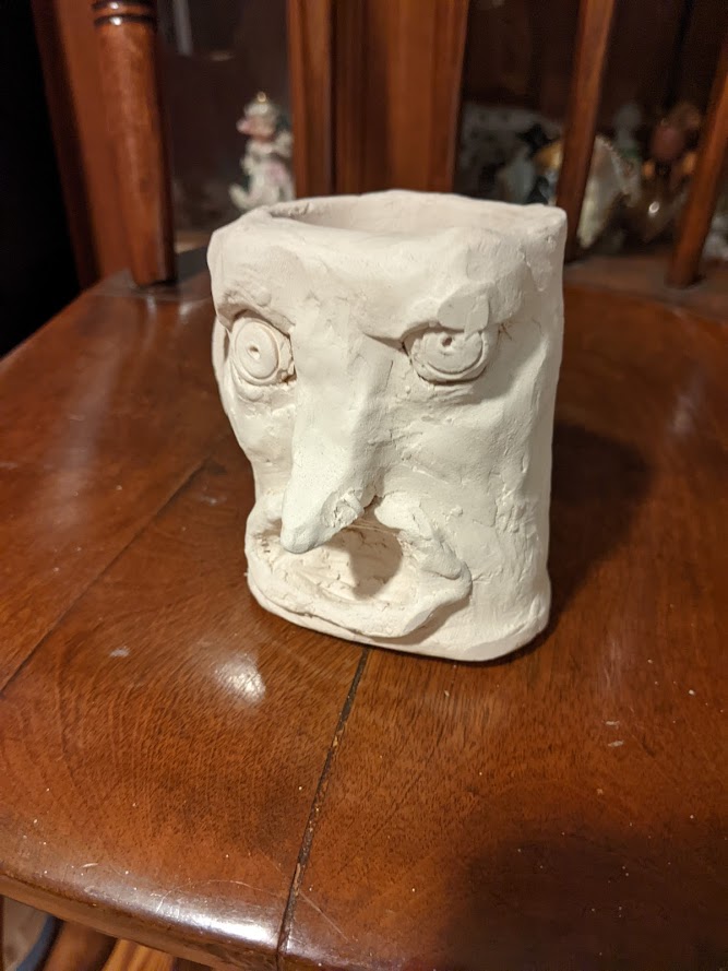 I got out the Dremel and gave all of the rough edges a light sanding. I created the teeth with air dry clay pressed into that gaping hole. The wart on the nose was a flaw in the original. Because it has only been fired once and I painted it with your garden variety of acrylic craft paints, it isn’t something you would want to drink out of (if you could, it isn’t actually very conducive to being an actual mug). It would make a great pencil holder or just something odd to sit on a shelf and gather dust while staring at you with that grimace on its face. I’m certain the Original Artist had something much “darker” in mind, but this is the cup rescued.