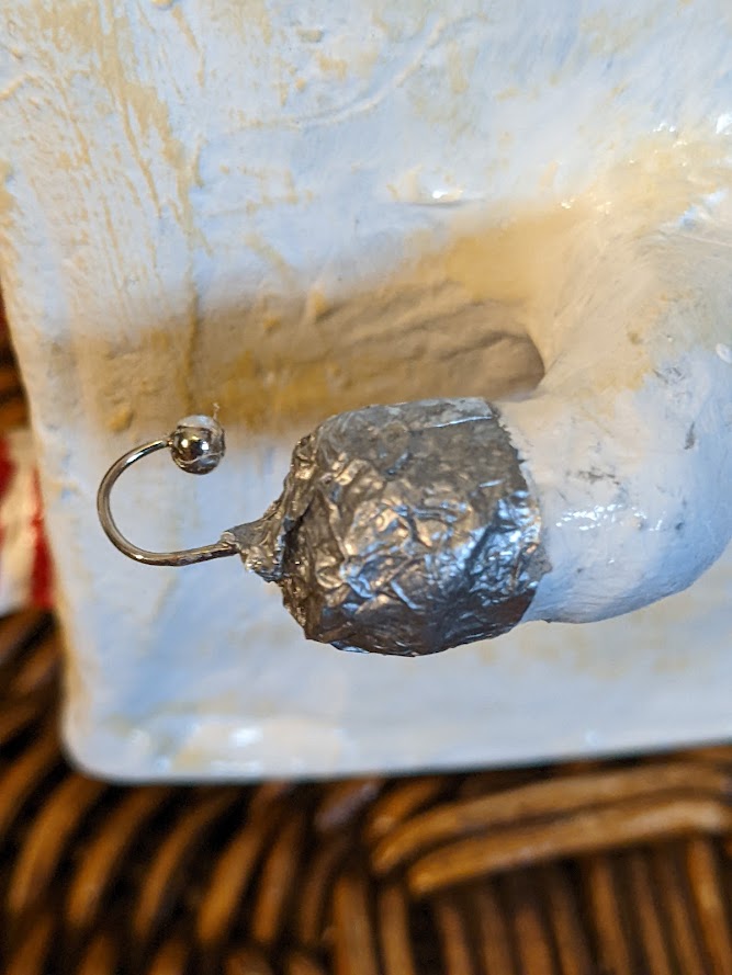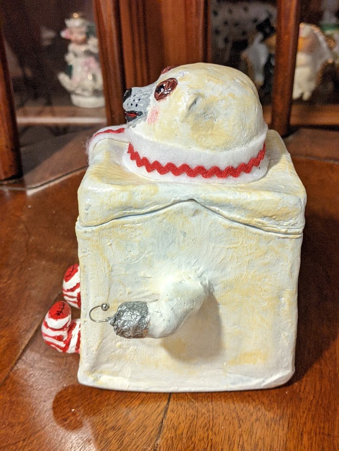 I took apart a “fish hook” earring hook, snipped it to size, and hot-glues it into position for the hook. Aluminum foil glued down tight and a double coat of silver paint finished off the “hook” effect. Now paw, no problem. I now have a polar bear with a hook for a paw. I left the inside unfinished. I figure it will be a boy’s “treasure” box for found items like feathers, rocks, screws, nails, and robin’s egg shells. I might have a grandchild in mind as well.