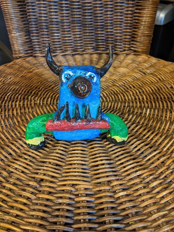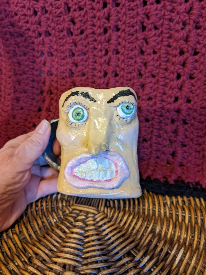 I got out the Dremel and gave all of the rough edges a light sanding. I created the teeth with air dry clay pressed into that gaping hole. The wart on the nose was a flaw in the original. Because it has only been fired once and I painted it with your garden variety of acrylic craft paints, it isn’t something you would want to drink out of (if you could, it isn’t actually very conducive to being an actual mug). It would make a great pencil holder or just something odd to sit on a shelf and gather dust while staring at you with that grimace on its face. I’m certain the Original Artist had something much “darker” in mind, but this is the cup rescued.