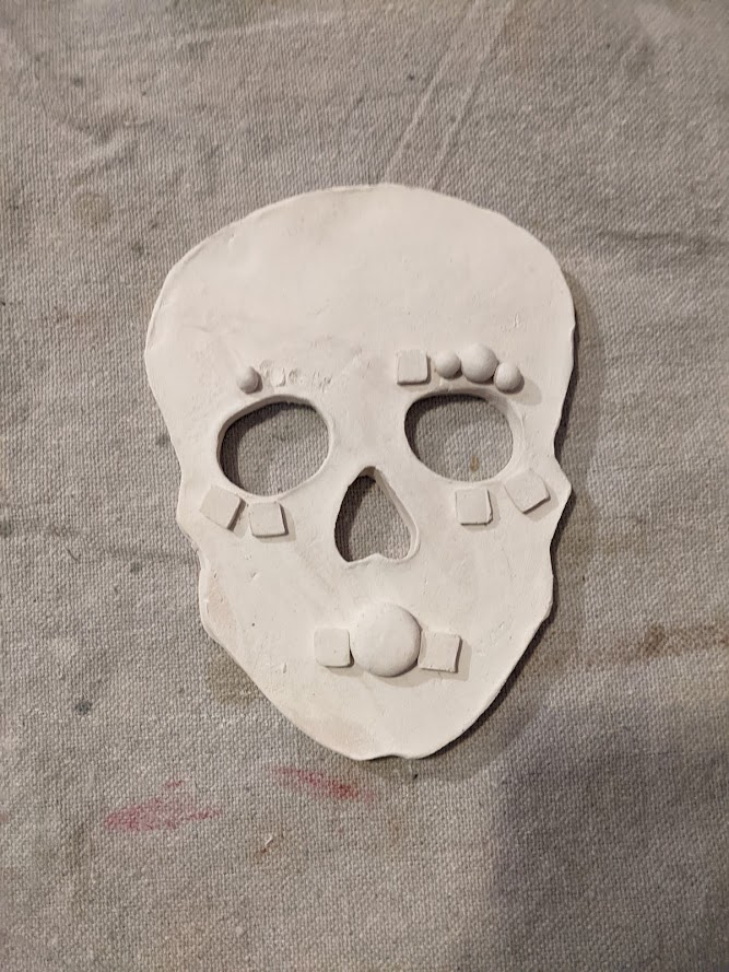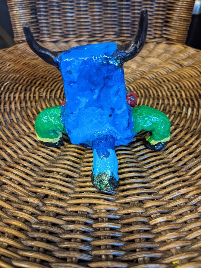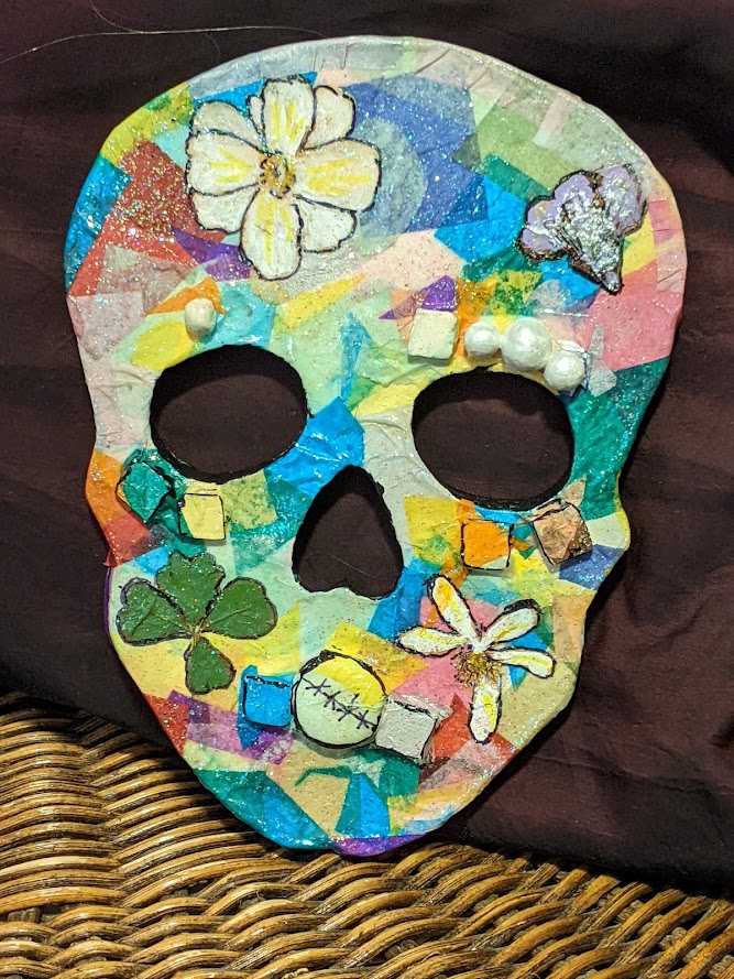 Of the four items my friend gave me, the Dia de los Muertos mask was the least inspiring. My birthday falls on the Day of the Dead (November 2nd) so I should feel inspired, right? It’s just that all the masks I have seen were mundane. A quick search of images on the Internet showed me just how wrong my assumption was. The raw mask is missing some pieces of clay, but that is what makes it “fun”. I used the same tissue paper/liquid starch/varnish style I used in my previous blog.
