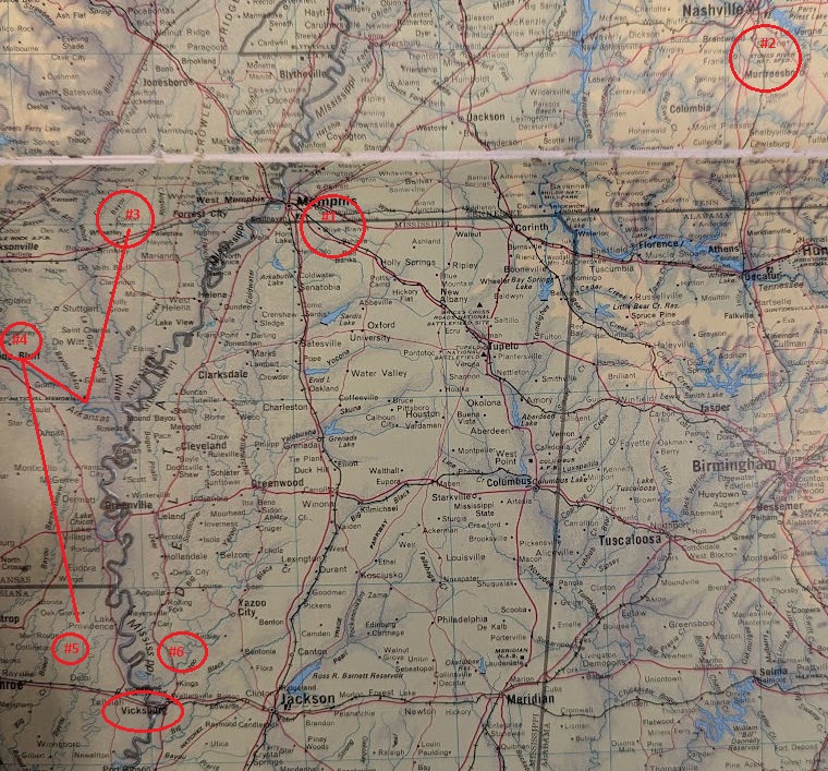 I tried to locate all their positions on a map. All of this is leading up to the Siege of Vicksburg which took place May 18 – July 4, 1863 which cost the Confederacy some 32,363 souls. It was a decisive Union victory and led to the ultimate push by General Sherman to the sea.