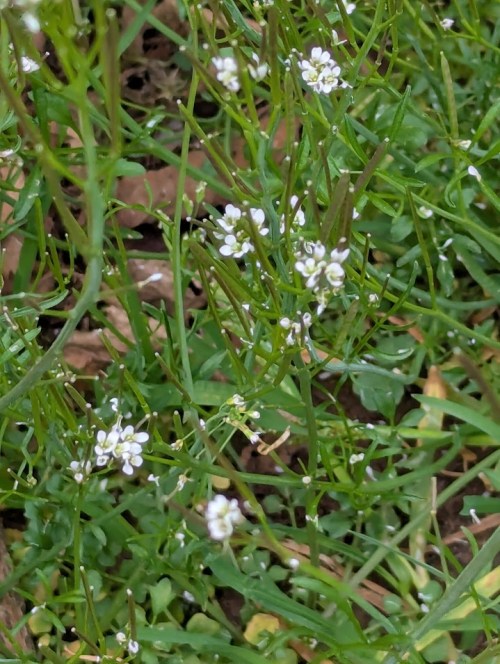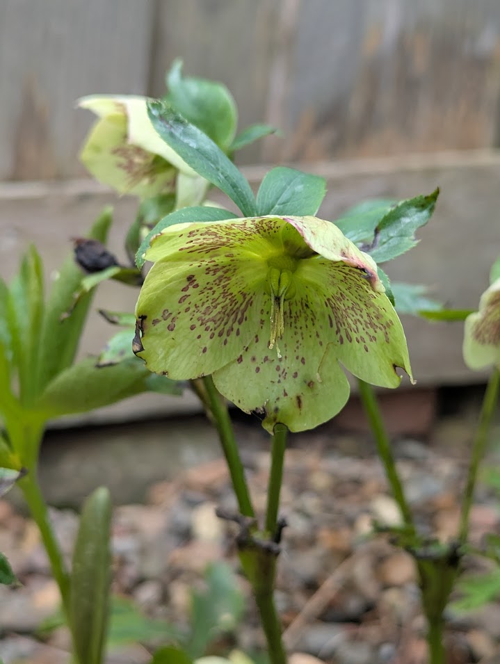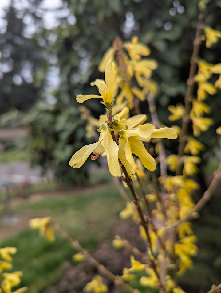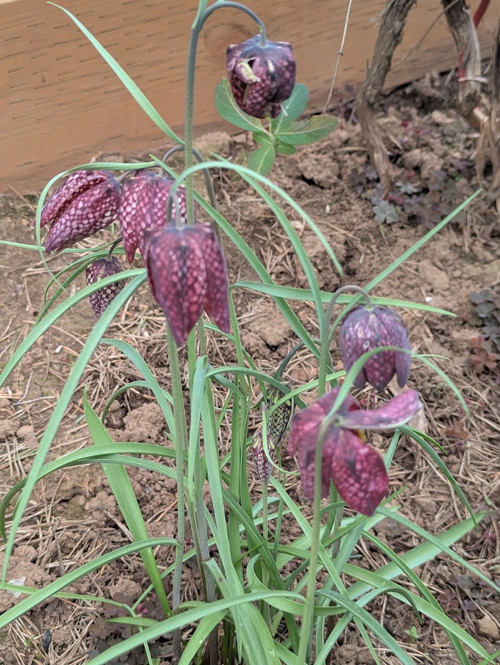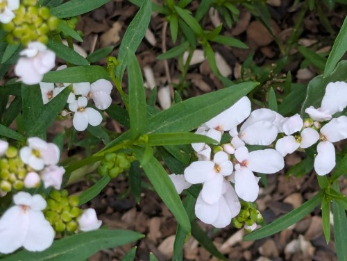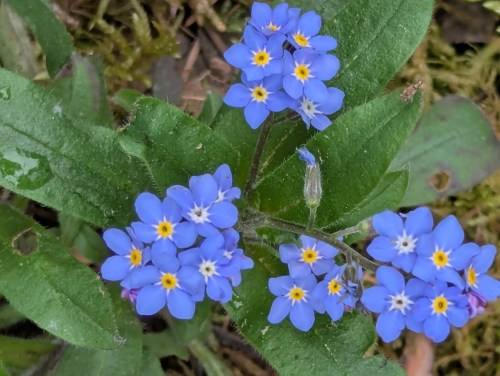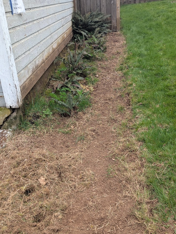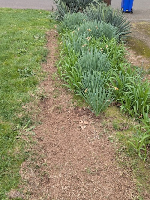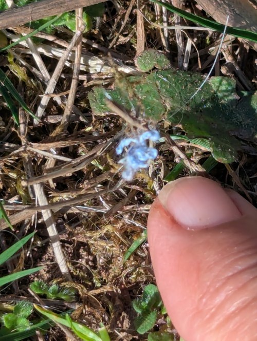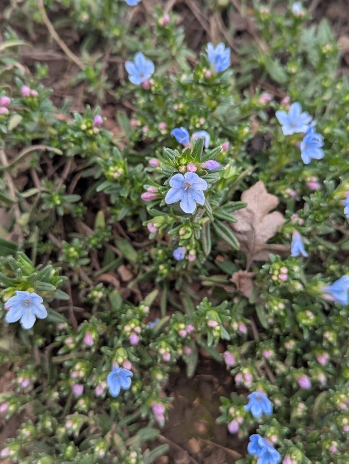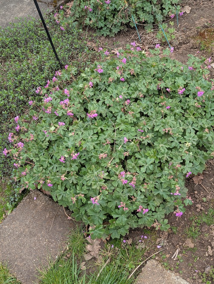 Forget-me-notLenten roseCheckered lilyrosemaryearly tulipsbaby blue eyeslithodorageraniums“honesty” or silver dollar plantcandy tuftforsythiaPart of my on-going “war” with the neighbor’s lawn guy who keeps mowing my ferns in our little right-of-way between properties. I still need to edge and plant some bleeding hearts.The other view of the “disputed” area (the lawn guy is the only person who doesn’t understand property lines – the neighbor gets it). I’ll edge this as well and add some more plants after I finish weeding.My husband and I spent so much time trying to figure out what this pretty blue flower was. The App on my phone kept coming up empty. So tiny, so pretty…Then I got a good close up of it and it is actually lint from a blue towel that was hanging on the clothes line a few days earlier.