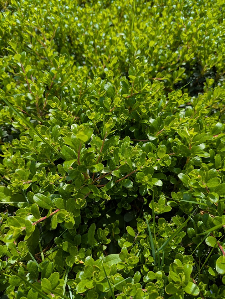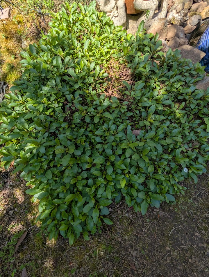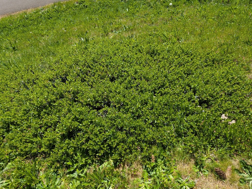 Kinnickinnick – Arctostaphylos uva-ursi. “Bear berry”. This is a common ground cover along commercial buildings in the Pacific Northwest. It blooms with tine red flowers, produces some berries, acts as a weed guard, is drought tolerant, and native. It is fast spreading. This is just one plant that was about 6” wide when Don first dug it up. It now covers an area of about 8×4’, and even the torpedo grass under it struggles to survive. I have read the fruit is edible, boiled, but I leave it for the birds. Native mining bees love the flowers.