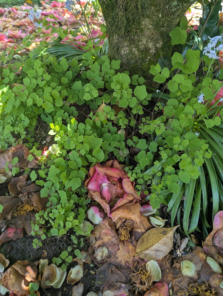 Inside-out flower – Vancouveria hexandra. We bought the first one at Portland Nursery some years back, but have since added more to the yard as hitch hikers with other plants. I can’t begin to tell you how much I love this shade-loving, fast spreading, resilient, and odd flower. I planted it under the Camellia where the only other ground cover was Bishop’s weed. And for years I thought the Bishop’s weed would one day win out, but as I was weeding and raking away old Camellia blossoms this year, I came to the realization that it was the Inside-out flower that was winning the fight for space in the shade.