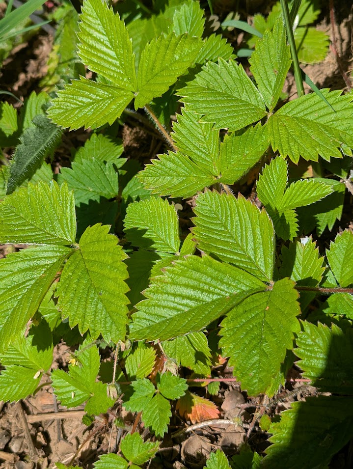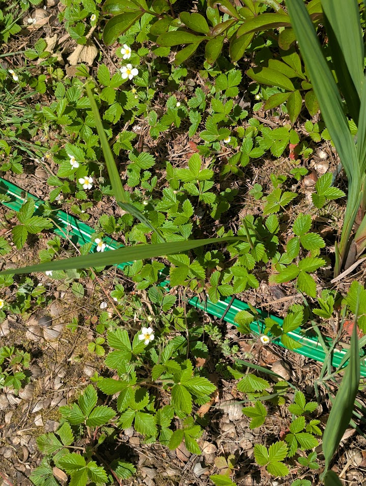 Wild strawberries – This native ground cover is most likely Fragaria vesca, or woodland strawberry. I rarely see the fruit on these as the birds and slugs beat me to them: the fruit is tiny, sweet, and it takes a lot of them to make a meal (usually a pancake breakfast when camping and foraging). They don’t bother other plantings and don’t really keep the ground moist, but they are evergreen, and that counts for a lot as other flowers fade. Fast spreading, easy to control, drought tolerant. Don planted this a long time ago and I wasn’t pleased, but I have grown to be happy with it.