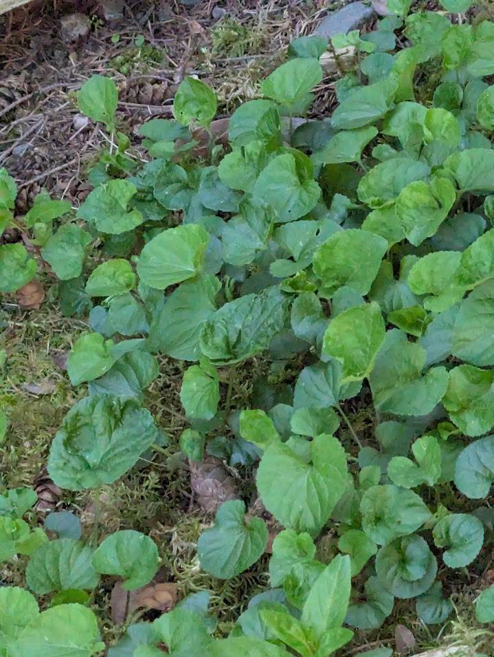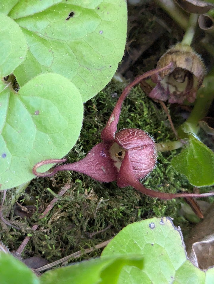 Wild ginger – Asarum canadense L. – This also started as a single clump of ginger roots dug up in the forest. It is not the same as the ginger root one buys in the grocery although the roots are edible. It is a shade plant, loves moist ground, and spreads slowly. Birds, bees, and even a rodent or two love it . The flowers are stunning, but you have to look hard to find them. Evergreen.