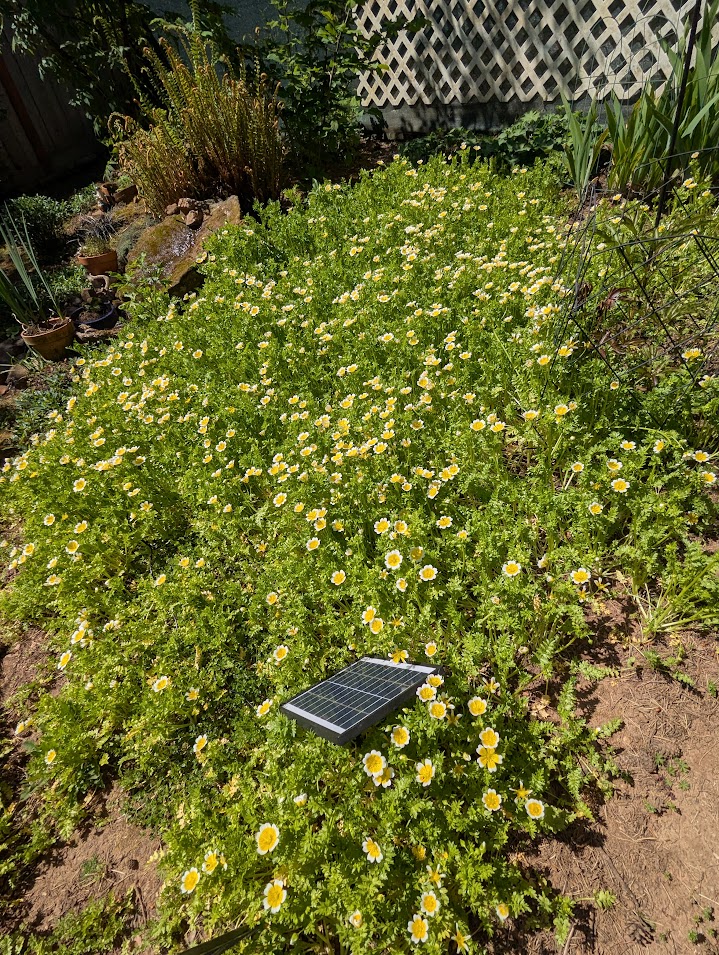 Douglas Meadowfoam – Limnanthes douglasii. Poached egg plant, so called because of the beautiful flowers. One or two showed up when we planted a yew and a big-leaf maple tree (both of which later died, sadly). They have spread to cover half of the flower bed in my little “prayer garden”. They start growing in early winter, covering the ground with greenery. The bloom is in early spring. By the time the heat comes on, the lants wither and die, like the bleeding hearts. I have tried other plantings to cover up the barren soil there, but this delicate ground cover doesn’t tolerate other plantings too much. Peonies are about the only exception. I don’t want to lose this ground cover, so I put up with barren ground for a couple months every year. It is worth the price when they bloom!
