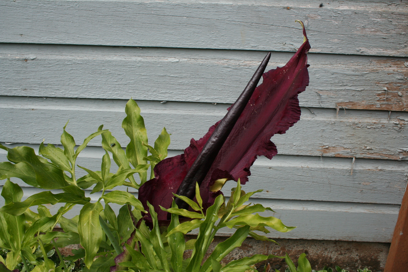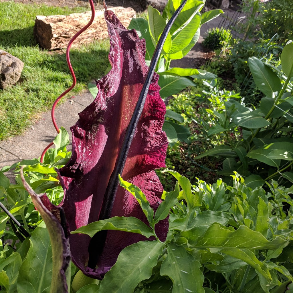 But before it does, at the end of May and always on our anniversary on the 7th of June, the aroma of rotten hamburger wafts in the air: the Dragon Lilies have opened. Flies and beetles rush in to await their demise in bowl of this carnivorous beauty. The smell lasts a couple days. The flowers wilt and the entire plant begins to wilt and turn yellow.