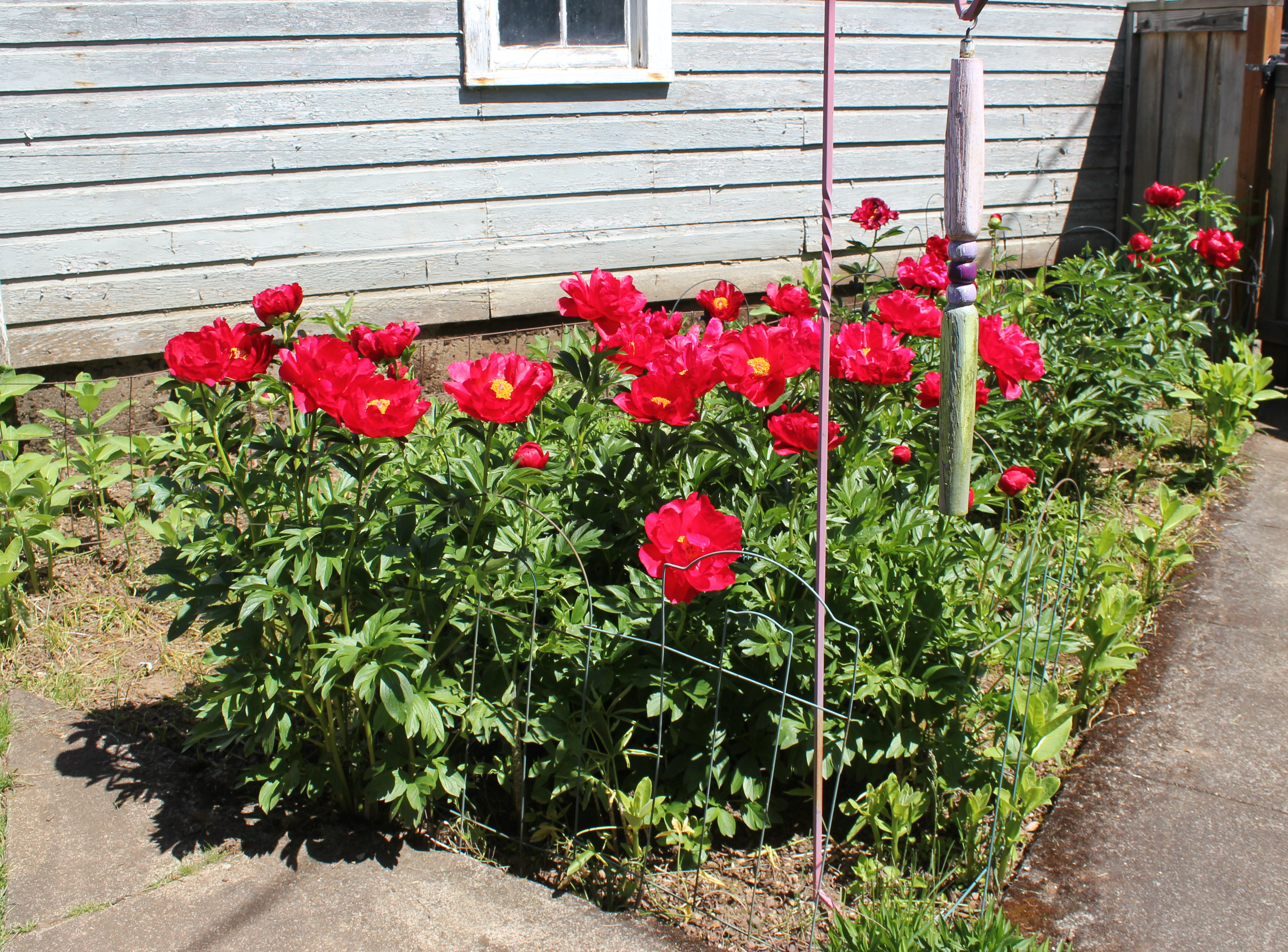 In the Spring, I cut back the old stalks of peony and aster just as the first new stems begin to push their way skyward around the fading hyacinth. Purple stems of peonies, green stems of aster, the spotted stems of Dragon Lily rise above the fading green and brown stems of faded hyacinth. Buds form on the peonies and soon the area bursts with pink and red peonies so thick I have to tie them to stakes to keep them upright.