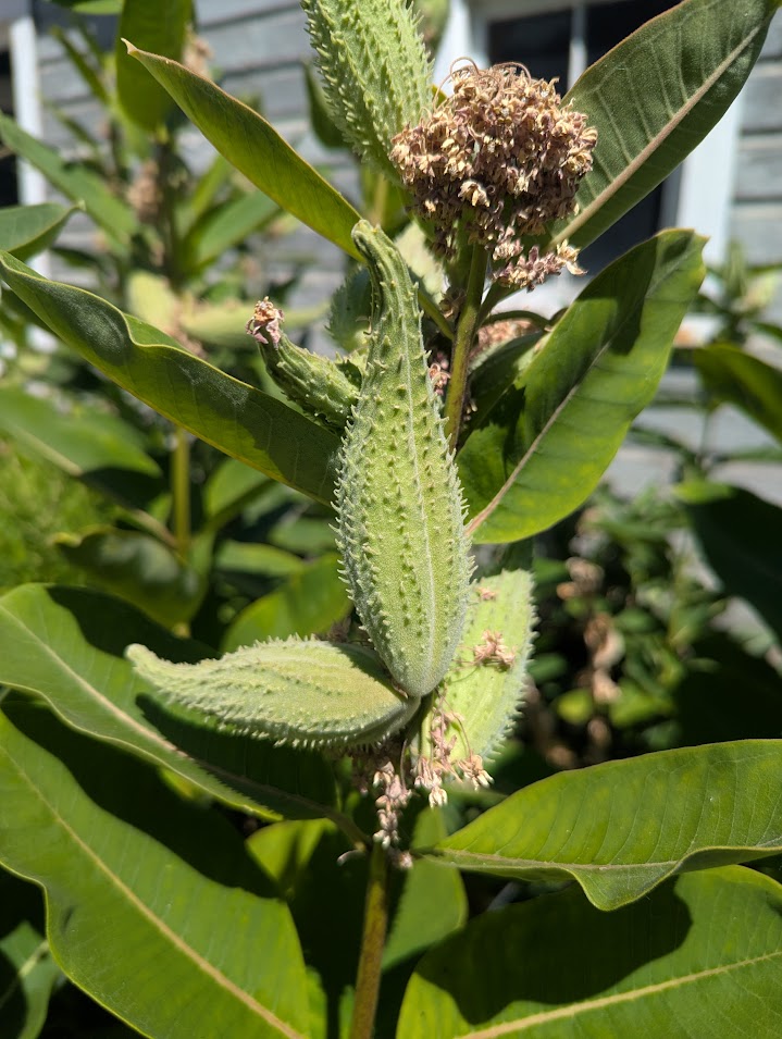 I planted it many years ago. It never sprouted. Four years later, there was a tiny plant that looked suspiciously like a milkweed growing next to some peonies. I clipped a leaf off to see if it would ooze the sticky white sap that gives milkweed its name: it oozed. Excited, I let it grow. The milkweed plants are limited to a “triangle” between the garage and two sidewalks. I cut them down when the seed pods appear: I don’t need more plants. Also, I don’t want to wait another four years for the seeds to sprout when the plant does just fine by sending out runners from those very sturdy rhizomes.