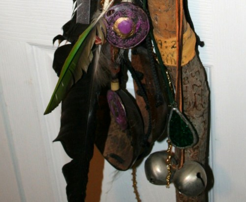 And I started tacking things on to the crow feathers. One of my parrot’s feathers. Some “bear balls” (jingle bells) that a girlfriend gave me when she thought I might go hiking in grizzly bear country (trust me: we were in bear country, but we had more to fear from the mosquitoes than any bear that never materialized). Bits of ribbon. A pair of favorite earrings after they broke. The green glass pendant that Arwen bought me when she went to a bluegrass festival with a girlfriend.