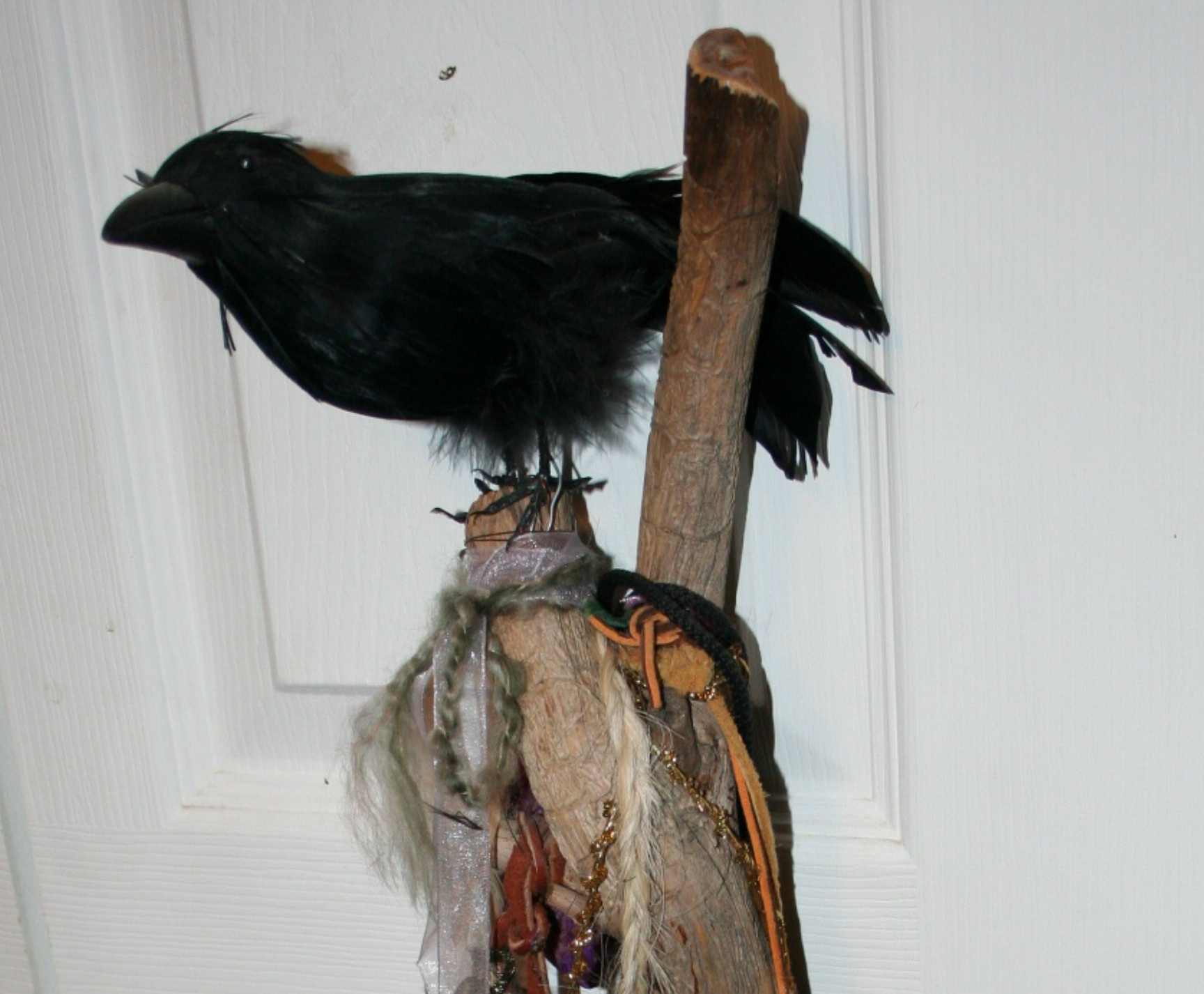 Then I found a couple crow feathers, so I tied them onto the stick.