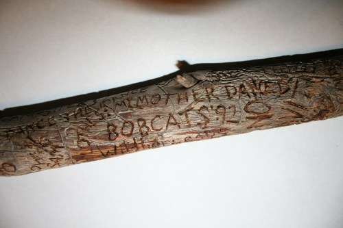 I found this dried up old limb on the ground as we hiked out a ridge. It was the right size for a walking stick and was much sturdier than the silver-grey wood suggested it should be. All the bark had long since rotted away, revealing the traces of some sort of borer beetles in the wood. The intricate patterns of their paths fascinated me. So I picked up the stick. Don warned me that it was too old to be a good walking stick, but he was wrong: the thing was not brittle.