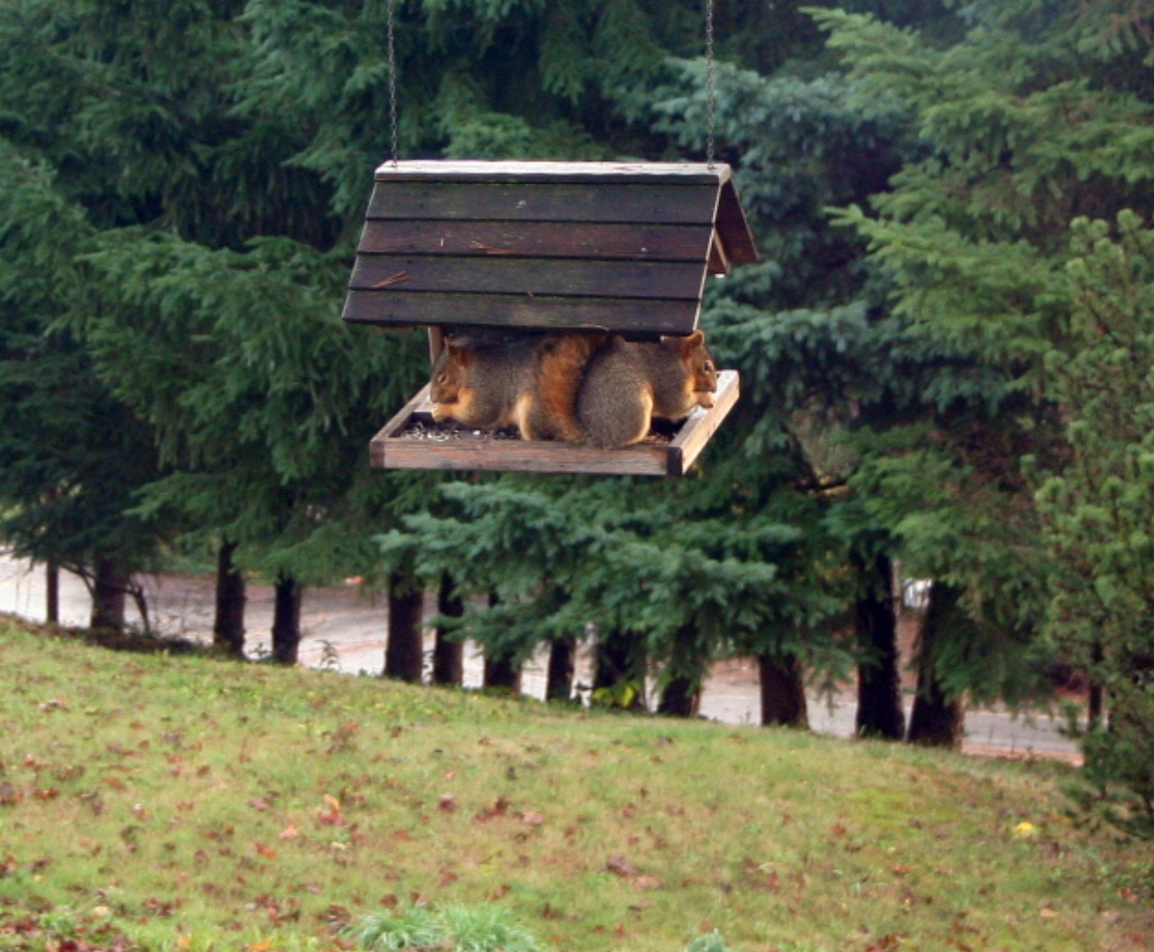 The Pirate Squirrel is the one on the left. He lost his eye sometime last spring, but he still commutes to our feeder on a regular basis. Usually, he is alone.