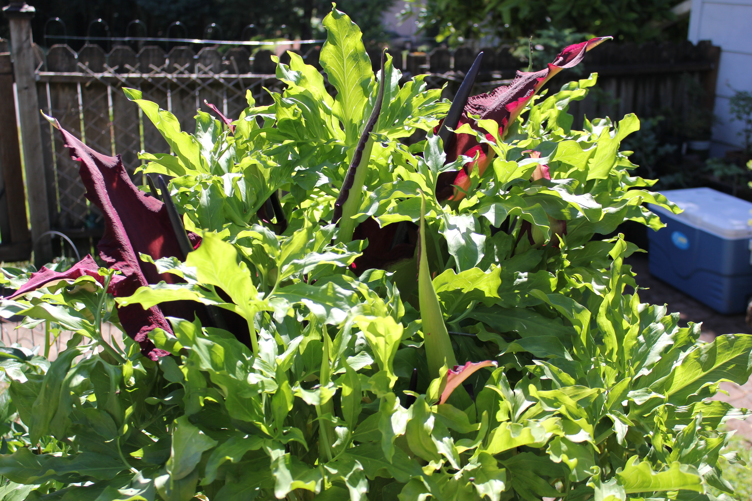 We counted at least 11 in one clump, 7 in another, and one on the far side of the yard. I’ll let the reader do the research: Voodoo lily. Dracunculus vulgaris. It’s an amazing plant in the arum family. Don and I found it in the yard of a rental we lived in, back in 1983-84. When we moved, we dug it up, filled in the hole, and transported the bulbs. The Lily loves the yard we have now – it’s been transplanted 3x and spent one year in storage when we were homeless.