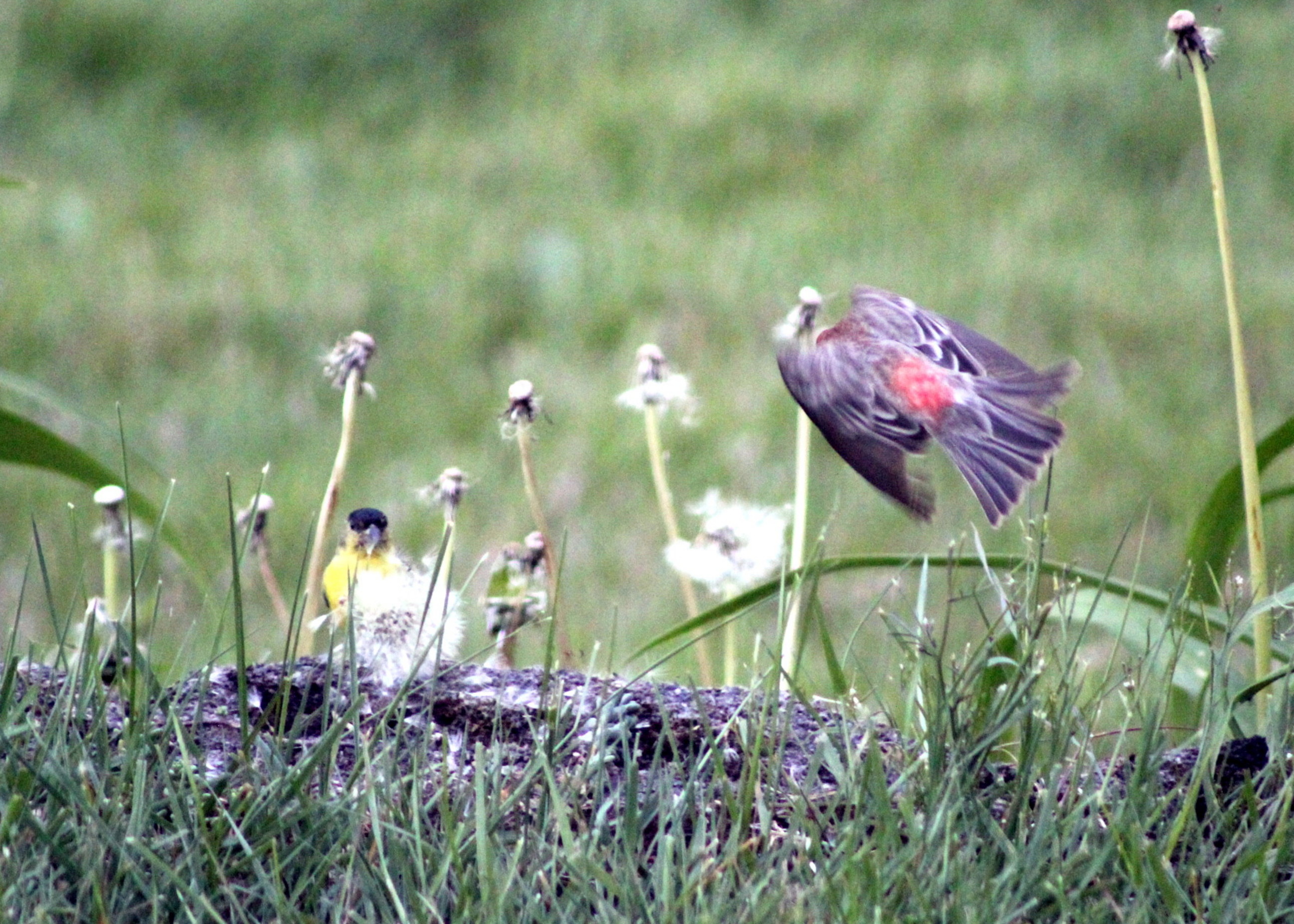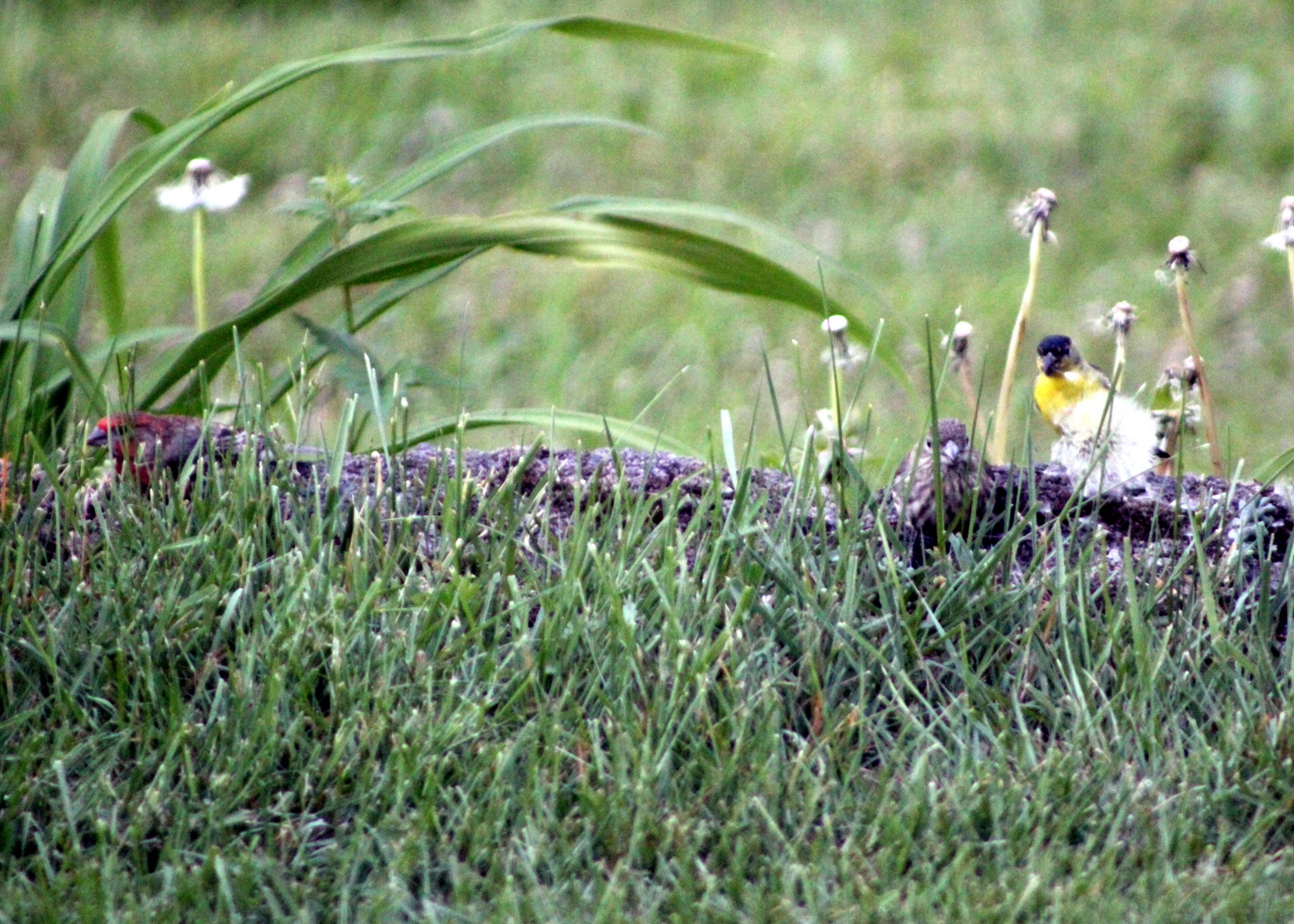 Last year, I added this plastic monstrosity to the front yard. It is there specifically for crows. They put everything into the water before they eat it: peanuts, bread and hamburger buns that other people toss them, and things I probably do not want to think about. I have yet to find a fledgling bird in there but fried chicken… Oh, yes. I hose it out over the retaining wall and think no more about it: whatever is in it drops behind the wall of orange daylilies, out of sight – out of mind.