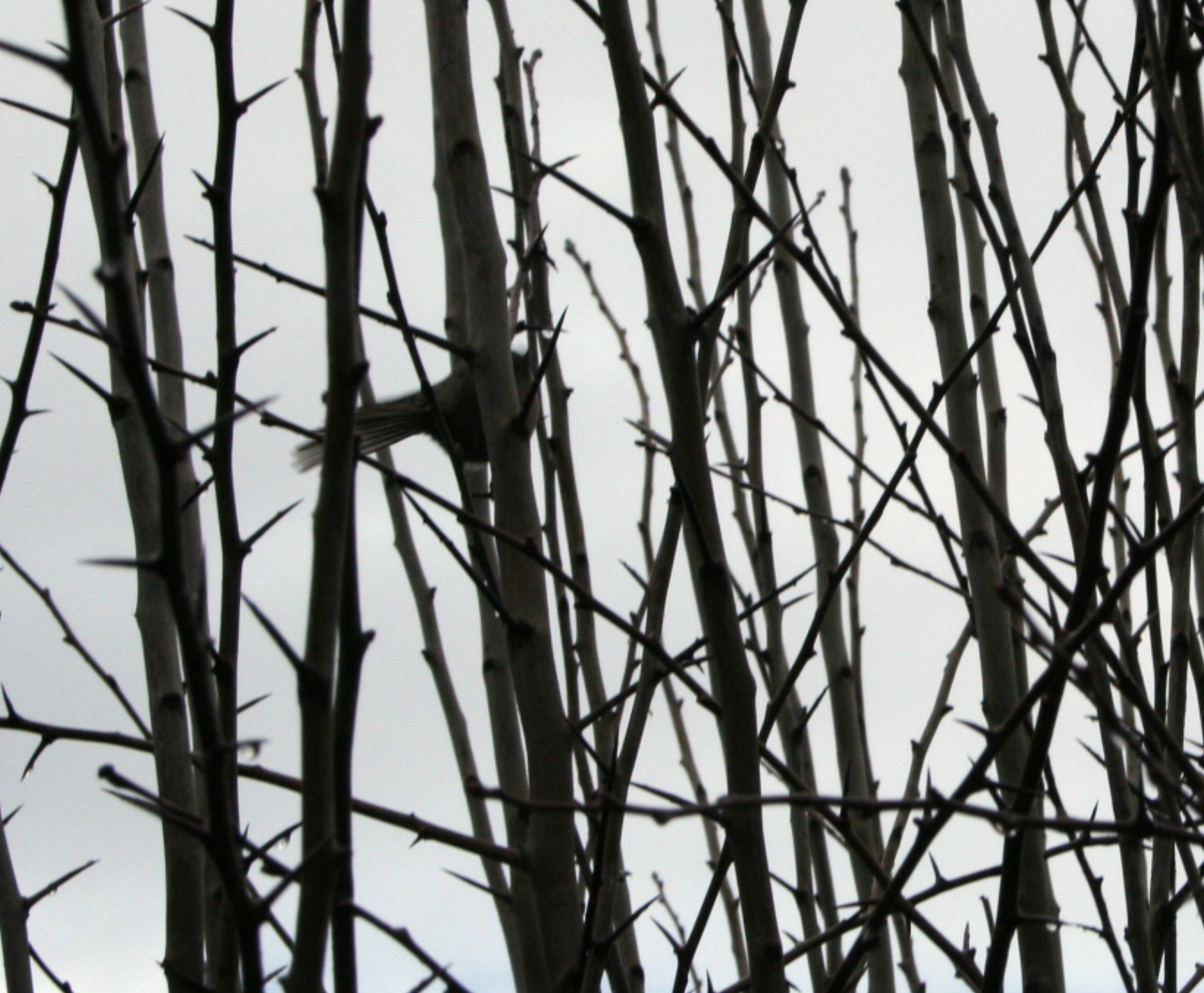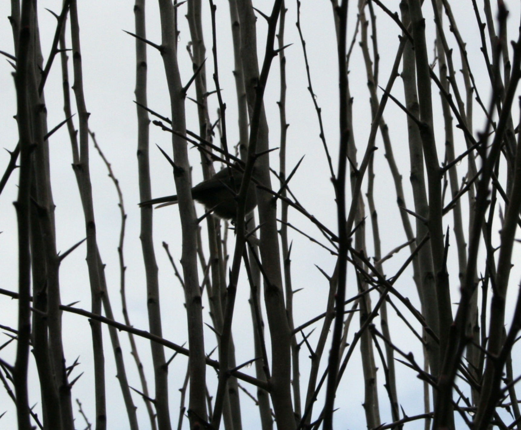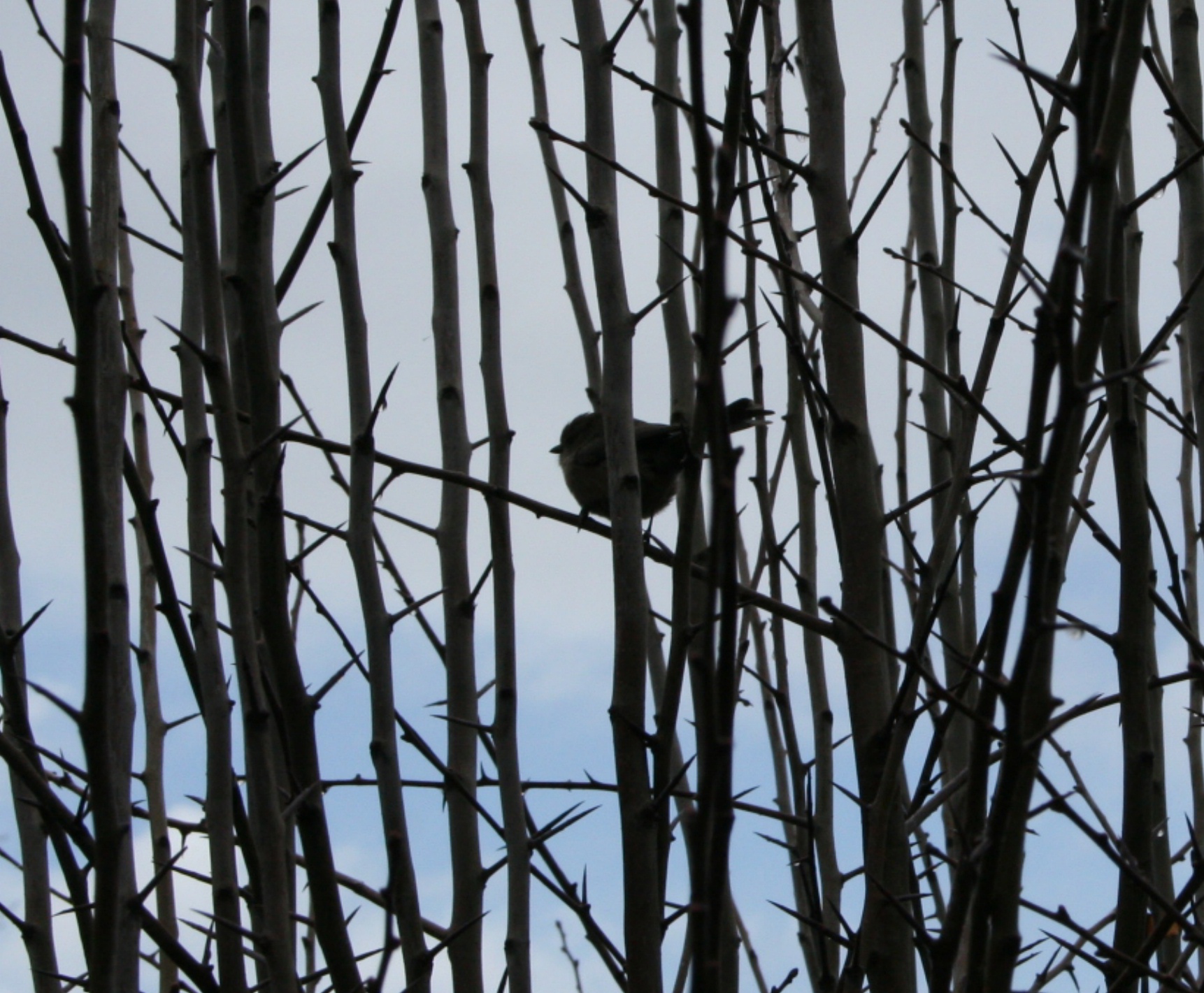 Where’s the bird? There are three of them in the photo. You’ll have to click on the photo to view it full size, but I promise you there are three little Bushtits in there.