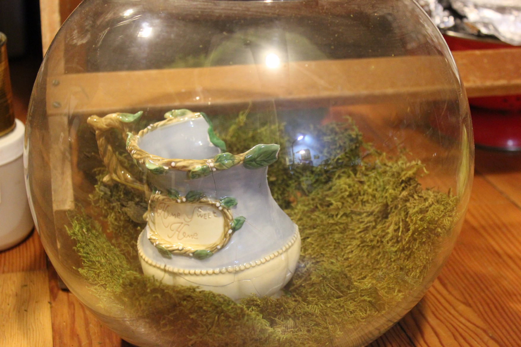 I started a Faerie House a month ago. Okay, a month ago, I took a hammer to a decorative pitcher in the pretense of starting a Faerie House. I really did have a plan, but it has stalled several times. And I dropped the pitcher which shattered it even more, and I had to glue it back together.