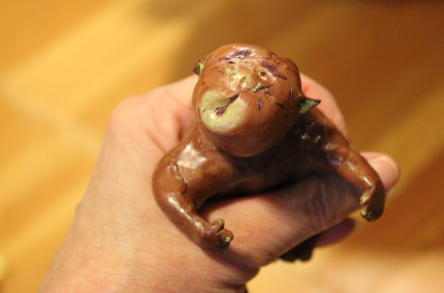 What is it?!! It is naked, I can assure you of that: we’re still in the debating process of what fabric to dress it in. It wants a Hawaiian style shirt, but I am not certain that is ogre/faerie appropriate. That’s tomorrow’s project: haul out swaths of fabric until we are both satisfied and then dress it. It looks slightly worried.