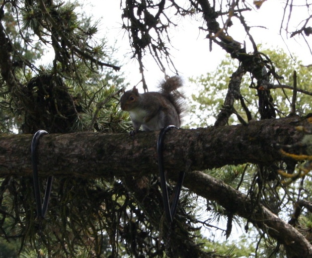 But before I spotted any birds in the birdbath, there was a chattering and commotion in the hazelnut tree that my husband has allowed to grow wild along the back fence. It’s in a part of the yard where we have done no landscaping. Neglected, wild, and overgrown. And now there was a squirrel chattering back there, presumably at Harvey as he wandered the perimeter of the yard.