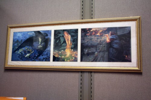The artist was Edward Robert Hughes (1851-1914). From left to right: “Night with her Trail of Stars and Her Great Gift of Sleep”, “Mid-summer’s Eve”, and “Twillight Fantasies”.