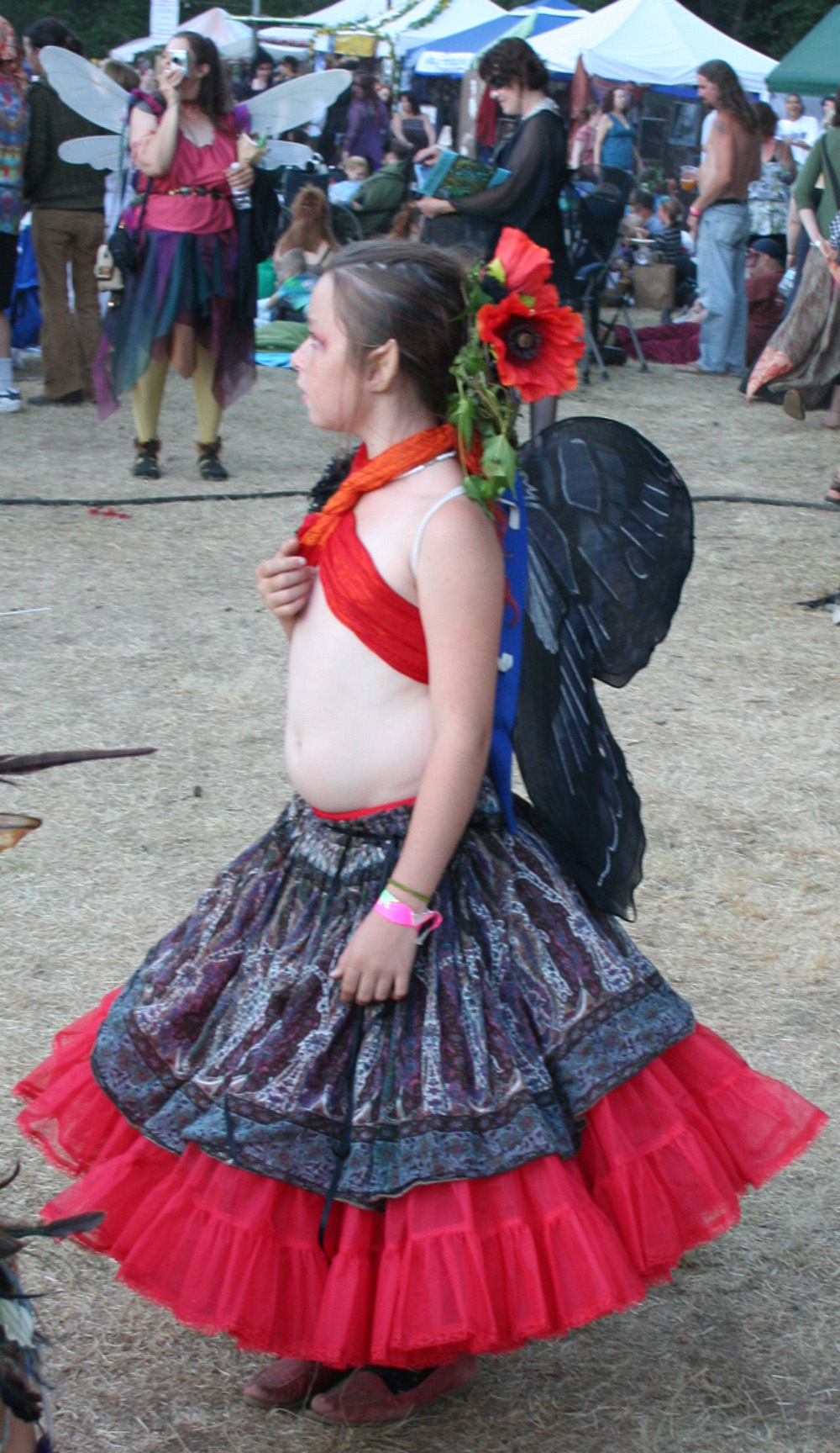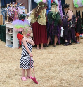 She exemplifies the shop-’til-you-drop hopes of the vendors here as her little faerie treasure bag sags to the ground.
