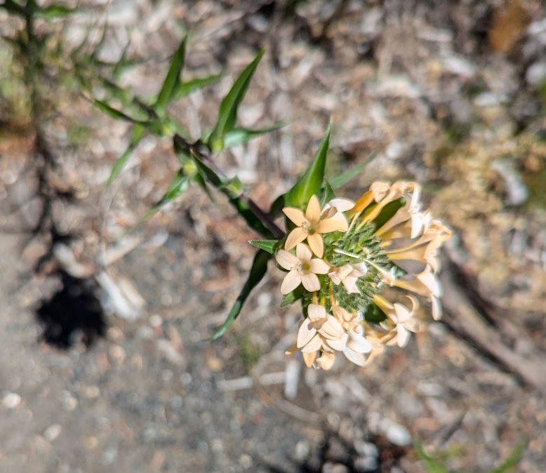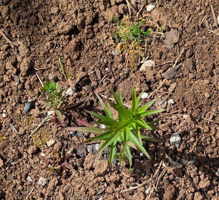 We discovered this growing along the roadside after a fire. It grows about 3-4′ tall. It is a native annual and we could purchase seeds (we tried seed collecting last fall, but beetles had devoured most of them!). This year, we dug one up (you can get a permit at the USFS). Hopefully, it makes it. Pic on the left is the one we dug up, pic on the right is a photo from last summer.