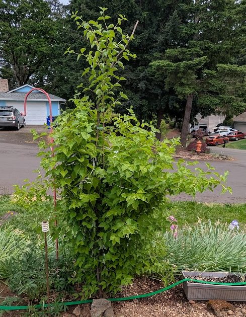 I bought a honeysuckle from a nursery. It is pretty. The aphids love it. But I *really* wanted a native one. Last summer, my husband and I made a foraging trip into the Cascades and found this growing there. No, I don’t have pics of the flowers (yet), but we know it is a hummingbird plant and it is what I wanted.