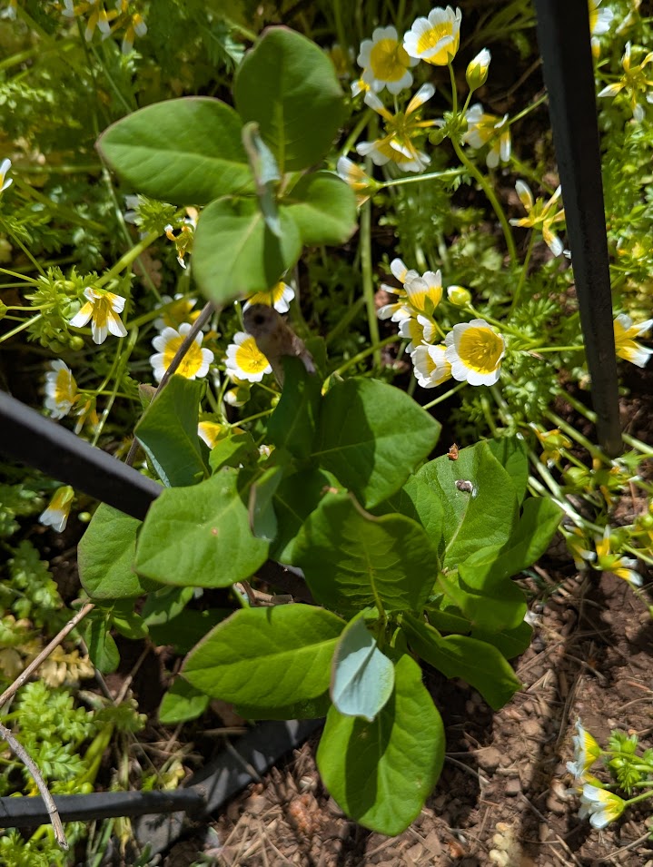 I planted it many years ago. It never sprouted. Four years later, there was a tiny plant that looked suspiciously like a milkweed growing next to some peonies. I clipped a leaf off to see if it would ooze the sticky white sap that gives milkweed its name: it oozed. Excited, I let it grow. The milkweed plants are limited to a “triangle” between the garage and two sidewalks. I cut them down when the seed pods appear: I don’t need more plants. Also, I don’t want to wait another four years for the seeds to sprout when the plant does just fine by sending out runners from those very sturdy rhizomes.