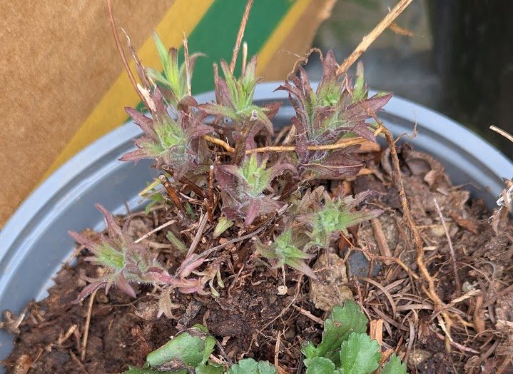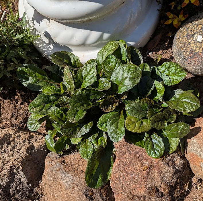 I found a third plant to put around the base of the pedestal birdbath: a tickseed (the yellow and red flower). A Bidens something – I’d never heard of this perennial, but I’m excited to add it to the base of the pedestal along with the bugleweed (ajuga) and my mystery plant.