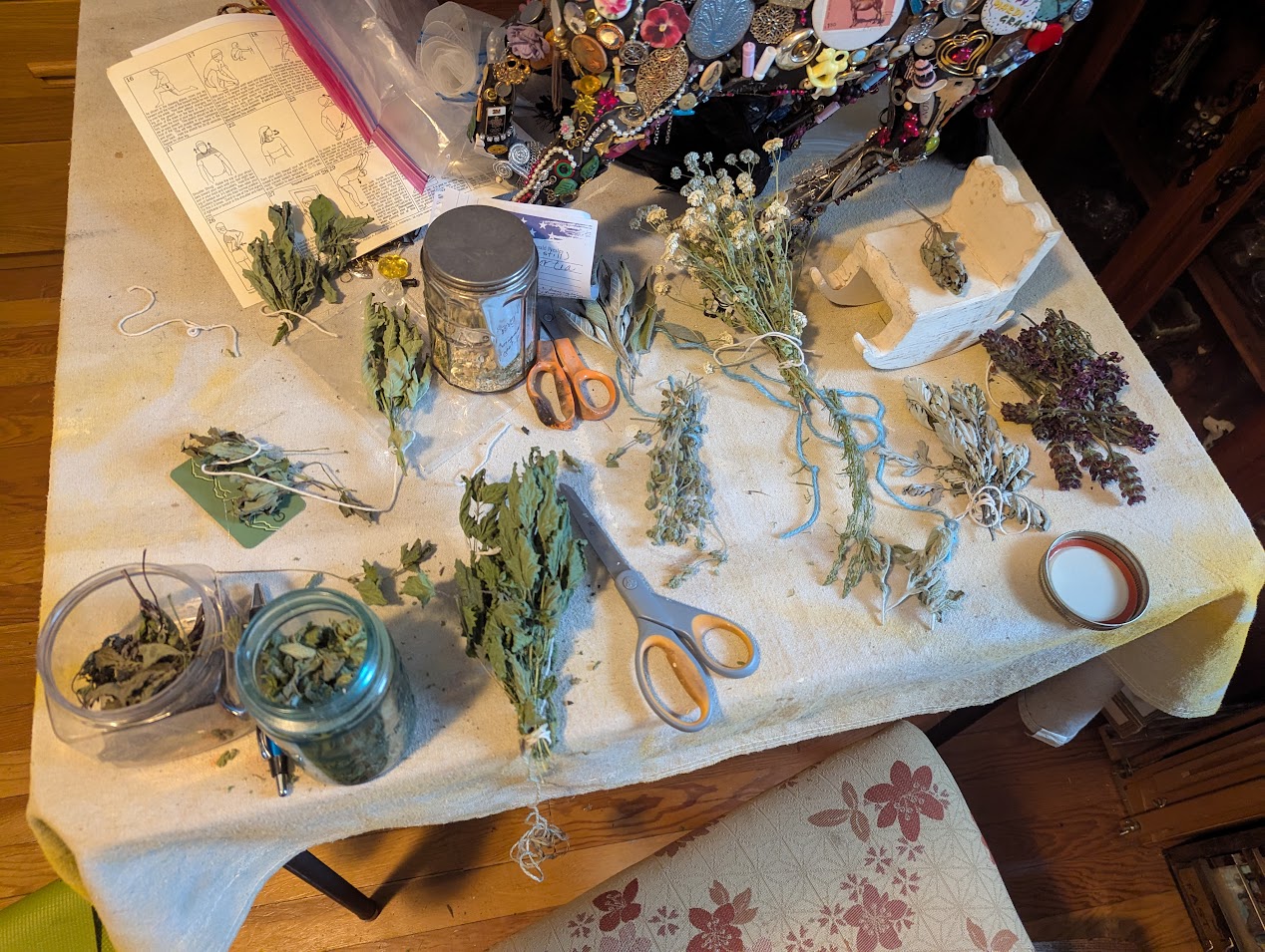 Gardening takes up the good weather season, and I have herbs hanging and drying up here as well. Herbs I have forgotten to label: sage, betony and bee balm, feverfew, self heal, horehound, peppermint, and nettle. I can smell the peppermint. The sage and horehound are easy: sage has a distinct aroma and horehound is also soft and grey. The feverfew is obvious with its white blooms as is the self heal with its purple ones. The bee balm and betony are probably the same, just one was labeled as “betony” and one was labeled as “bee balm” when I purchased the plants.