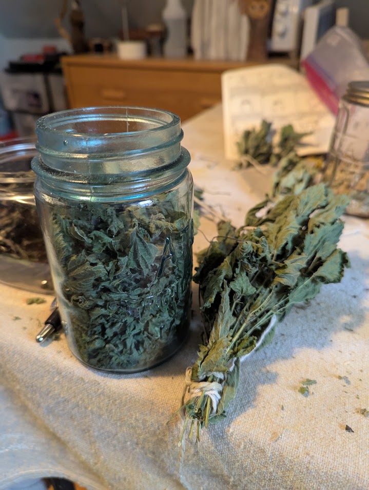 The nettle is the easiest to identify: despite being dry and the same color as the bee balm, nettle still retains a “sting” to its leaves. The sting isn’t close to what nettle feels like when it is alive and bare skin brushes against it; it is just an irritating little prick felt when stripping stems of leaves that soon disappears. I have more nettle than any other herb, mostly because I do not allow it to go to flower or seed: the plant I am growing is safe within the confines of a planter where one cannot accidentally brush up against it without protection.
