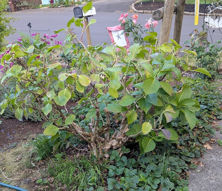 I hacked my poor hydrangea back by at least two feet. It used to be planted under the pine tree (Nature rest its branches and rotting roots). The pine tree fell over some seven or eight years ago. The hydrangea is now in full sun, and summers have heated up the past five or six years. I have covered it with umbrellas, sheets, and tablecloths, but it still gets sunburned. The flowers fade too quickly. It has grown spindly. I could either kill it outright or prune it way back and see if it survives.