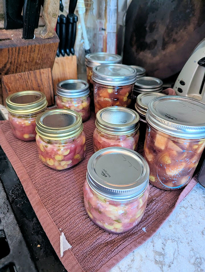 I have been busy canning enough for the two of us: salsa, compote, conserve, chutney. Herbs have been dried or are drying for herbal teas. We foraged huckleberries and elderberries from the National Forest (those are in the freezer, awaiting a moment of inspiration).