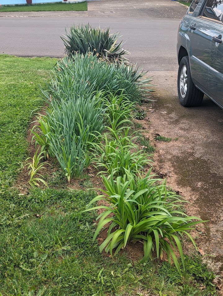 I’d love to show off the new flower bed I created in front of the house, where I have planted my rose (which is showing no signs of life!), a Rose of Sharon, and left room for many more perrennials while cutting down the need for lawn mowing. Purple anemones, Vinca Minor, hens-and-chicks, above the wall, Lady’s Mantle and orange daylilies below, on the city right-of-way.