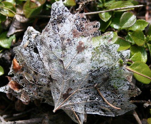 Rhododendrons, mahogany, and chinkapin push us away from familiar paths. There are no game trails to follow, but plenty of elk sign. We cross a space full of dead-fall, skeletal leaves of deciduous bushes and vine maples, when we find a chipmunk dying in the forest detritus.