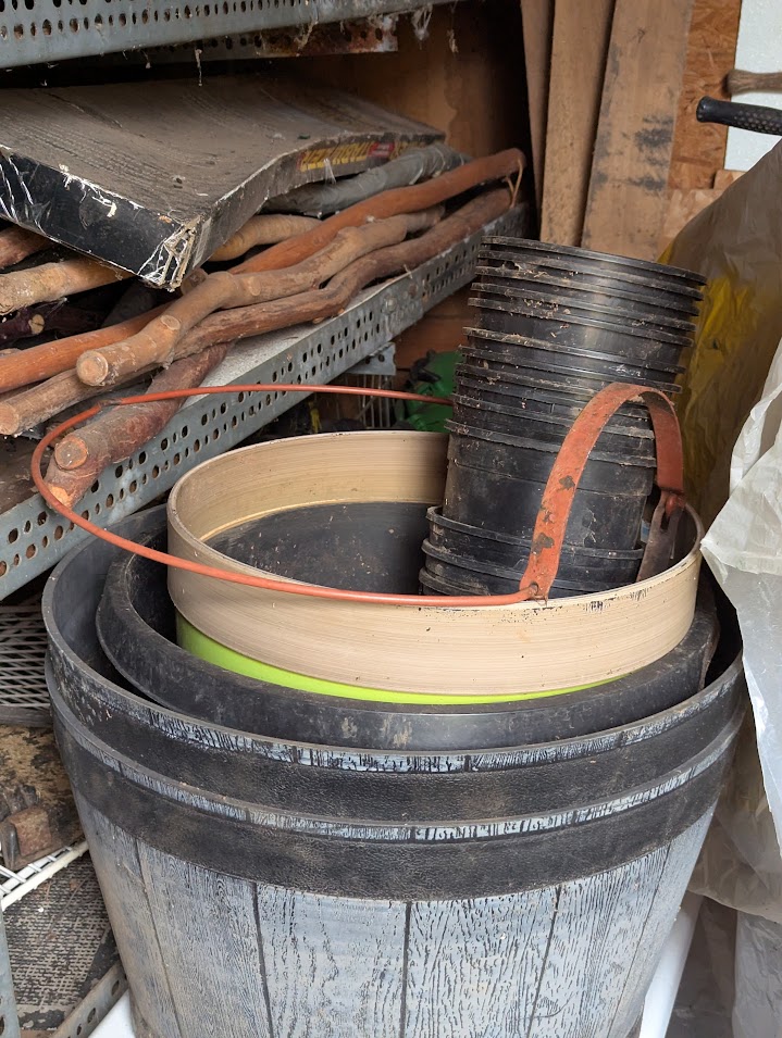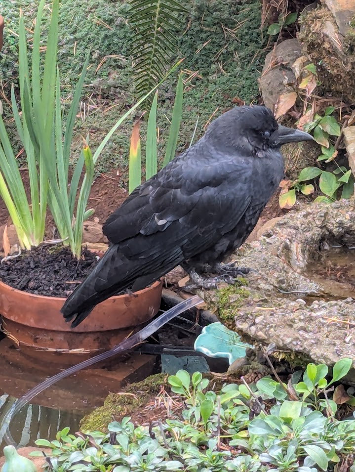 I didn’t find a lot of rocks in the way: I found the roots from the neighbor’s tall pine tree running through the ground, none of them larger than 1.5” diameter. I cut them out knowing they wouldn’t impact the life of the tree (which is dying anyway, but slowly, and due to a beetle infestation). I leveled the ground and installed the trough, planted the yellow flag irises in tubs, and filled the crater with water.