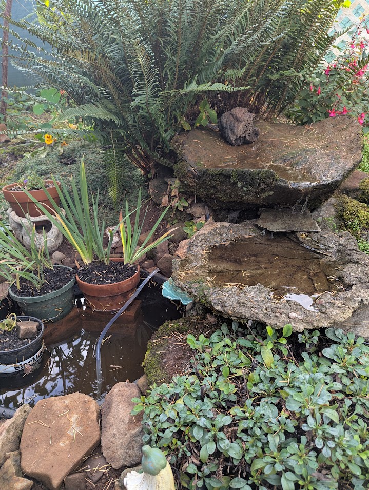 Before the weather turned and the cloud pattern changed, I finished up my second water feature. It needs a little fine tuning that won’t get done until the weather begins to warm back up, but I’m still pretty proud of what I created.