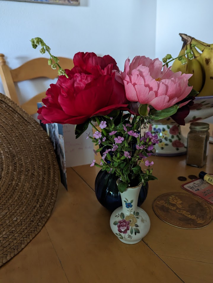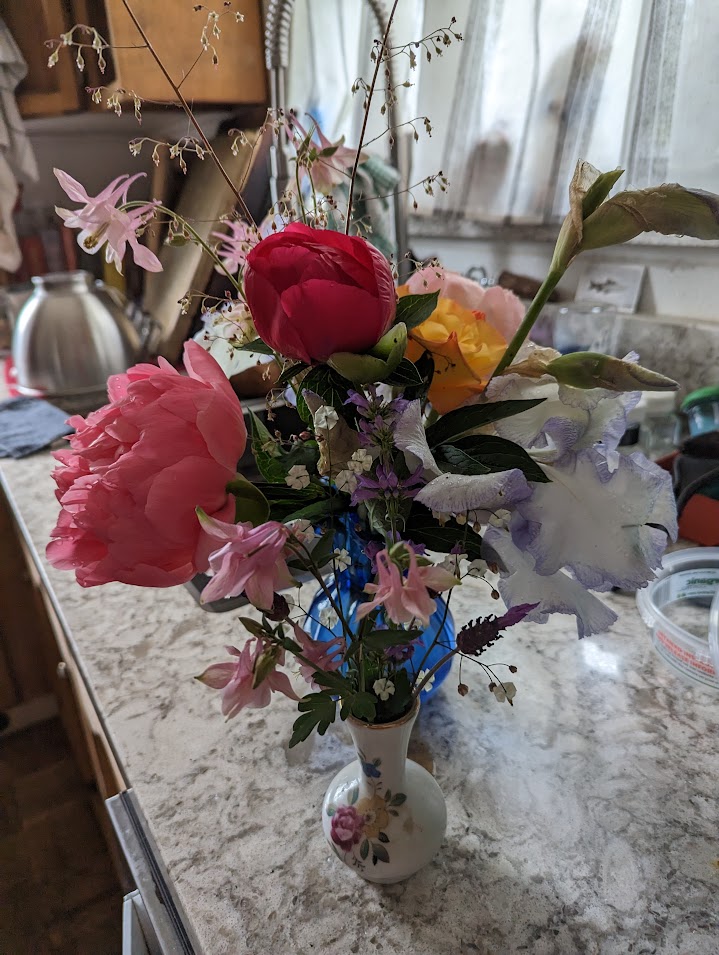 We went from a cold and drizzly April to a dry and sunny May. The garden has “popped” as they say. Flowers galore. The daffodils faded and the grape hyacinth followed them closely, then the blue and white hyacinths. The heat came on and the peonies reached for the heavens. The heat turned down and the peonies are hanging on to their blooms: blood-red, deep magenta, salmon pink, cotton candy pink, yellow, and white. Bomb peonies, doubles, triples, and tree peonies. Now the irises are clamoring for their time in the limelight: purple, blue-and-white, purple-and-yellow, yellow. Dutch, wild natives, Japanese, and flag. Out front, the geraniums and Solomon’s seal are in full array of pink and white and green.