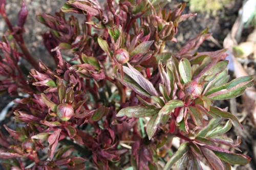 The brilliant red stems of peonies unfurling. Not all of the peonies have red stems and the leaves will change color as the mature.