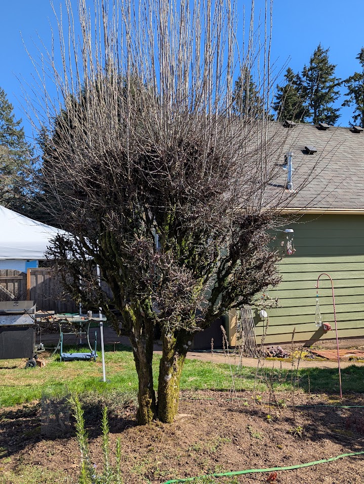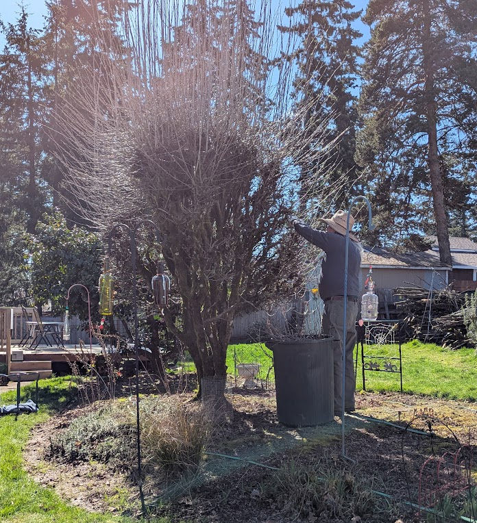 I hacked my poor hydrangea back by at least two feet. It used to be planted under the pine tree (Nature rest its branches and rotting roots). The pine tree fell over some seven or eight years ago. The hydrangea is now in full sun, and summers have heated up the past five or six years. I have covered it with umbrellas, sheets, and tablecloths, but it still gets sunburned. The flowers fade too quickly. It has grown spindly. I could either kill it outright or prune it way back and see if it survives.