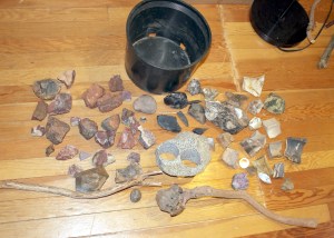 I keep finding rocks and instead of tossing them outside, I carefully haul them up the stairs to the loft, which is the last area I will be cleaning. I will have to make some hard decisions about rocks when I get to the loft. I am hoping it will be so much closer to spring and I will have a good idea where to put my “special” rock garden. I’ll have to toss all the agates. It’s not like we can’t drive a couple of hours to the coast and pick up more. I may have to admit to myself that I will never use the obsidian shards, though. Those were harder to come by.