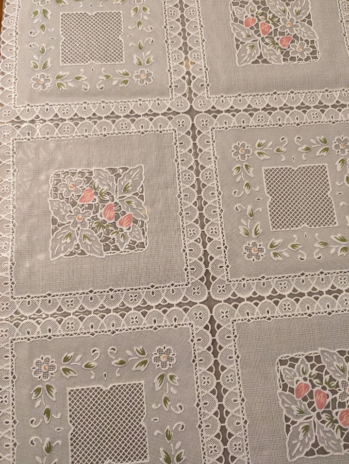 I still didn’t have the crock pot figured out. It’s oblong, for one thing. The calculations are going to be different. And I was out of enough calico to make that happen, anyway. But I do have a number of old tablecloths I have picked up at yard and estate sales and… Yes, I cut up a (stained) vintage tablecloth to make it work. I do not regret that decision. (Photos: before with the kitchen towel, after with the tablecloth skirt)
