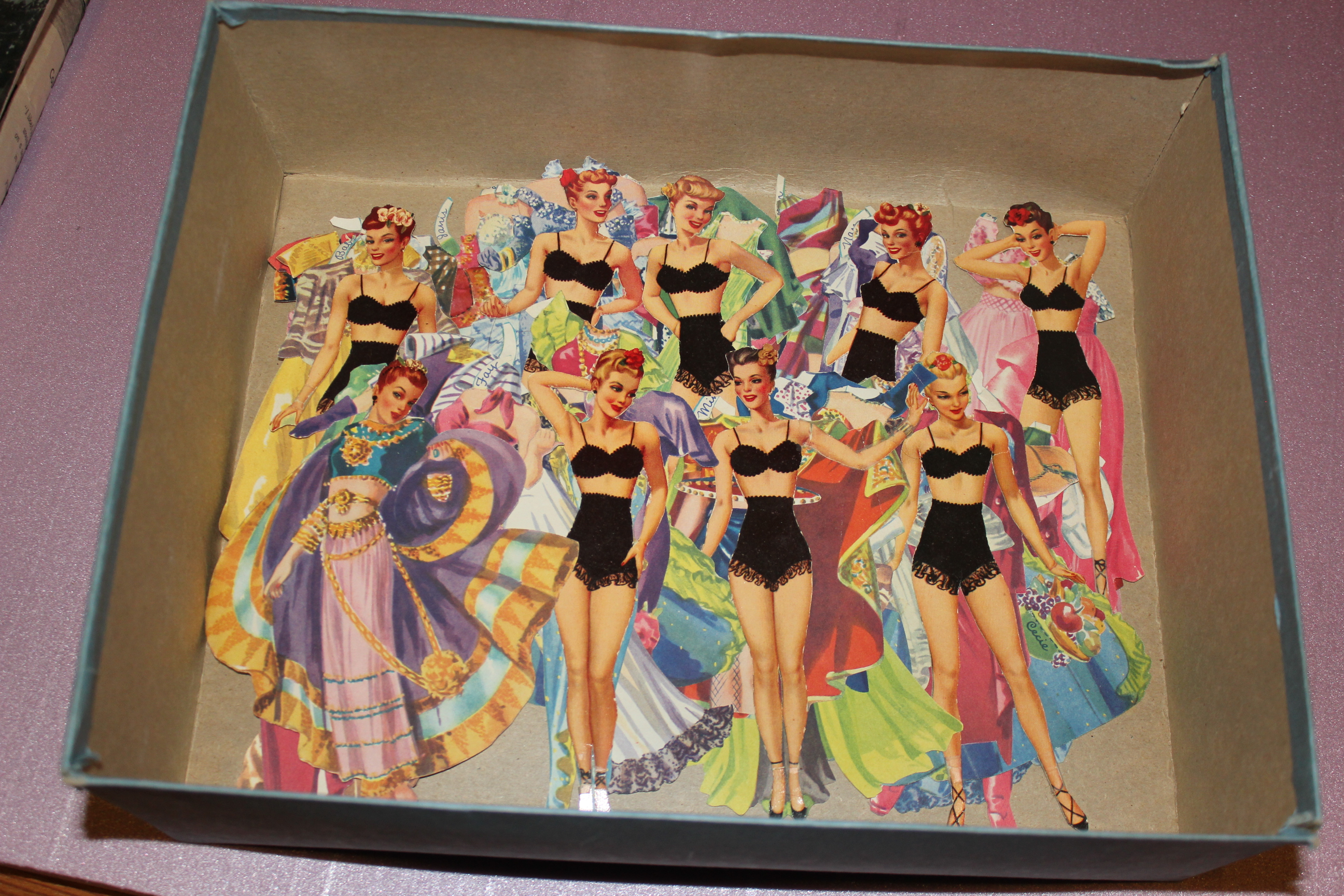 These boxes, nestled one inside the other, contained the sum total of my mother’s paper doll collection. The blue box housed the large paper dolls that came in sets, the cigar box hid the “Progress” box, and inside that box were the paper dolls Mom cut out of magazines and catalogs.
