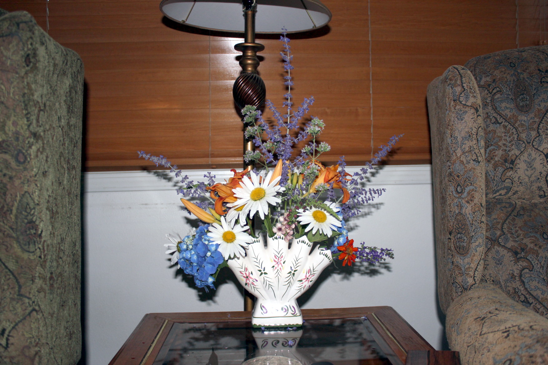 Another favorite was an Hispanic woman who really wanted the shoes I had for sale, but she wears a size 8 and they are all 7-7.5 shoes. All new because I bought them, wore them once, and realized they really hurt my feet because of my bunions or the straps or… She knew the value of them & was amazed at my price ($3/pair). That’s beside the point. She bought something, but commented on the hydrangea (center of the pic above). She loved it. Where did I get it? It was her mother’s favorite flower & her mother had several in Mexico.