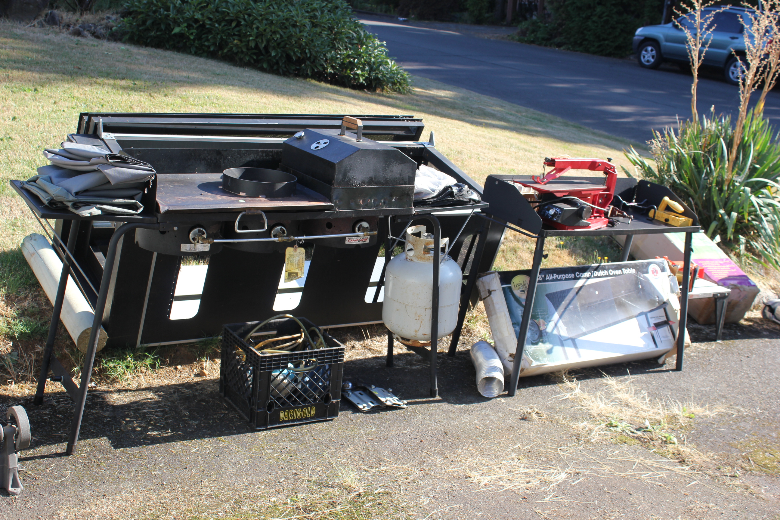 Don tried to sell it to a Boy Scout Troop for $100, but they claimed they didn’t have the money. We’ve used the heck out of this back when we had the F-250 and we could haul the kitchen sink with us camping. Once we had to down-size, the stove became much too big to haul with us. The Camp Chef Dutch Oven table next to it was a freebie to us and has never been used, but they weren’t interested in that. And the $150 on the stove was a bit too much for them, but they gave us their phone number just in case we did not sell it and they could convince the school that it was a good investment.